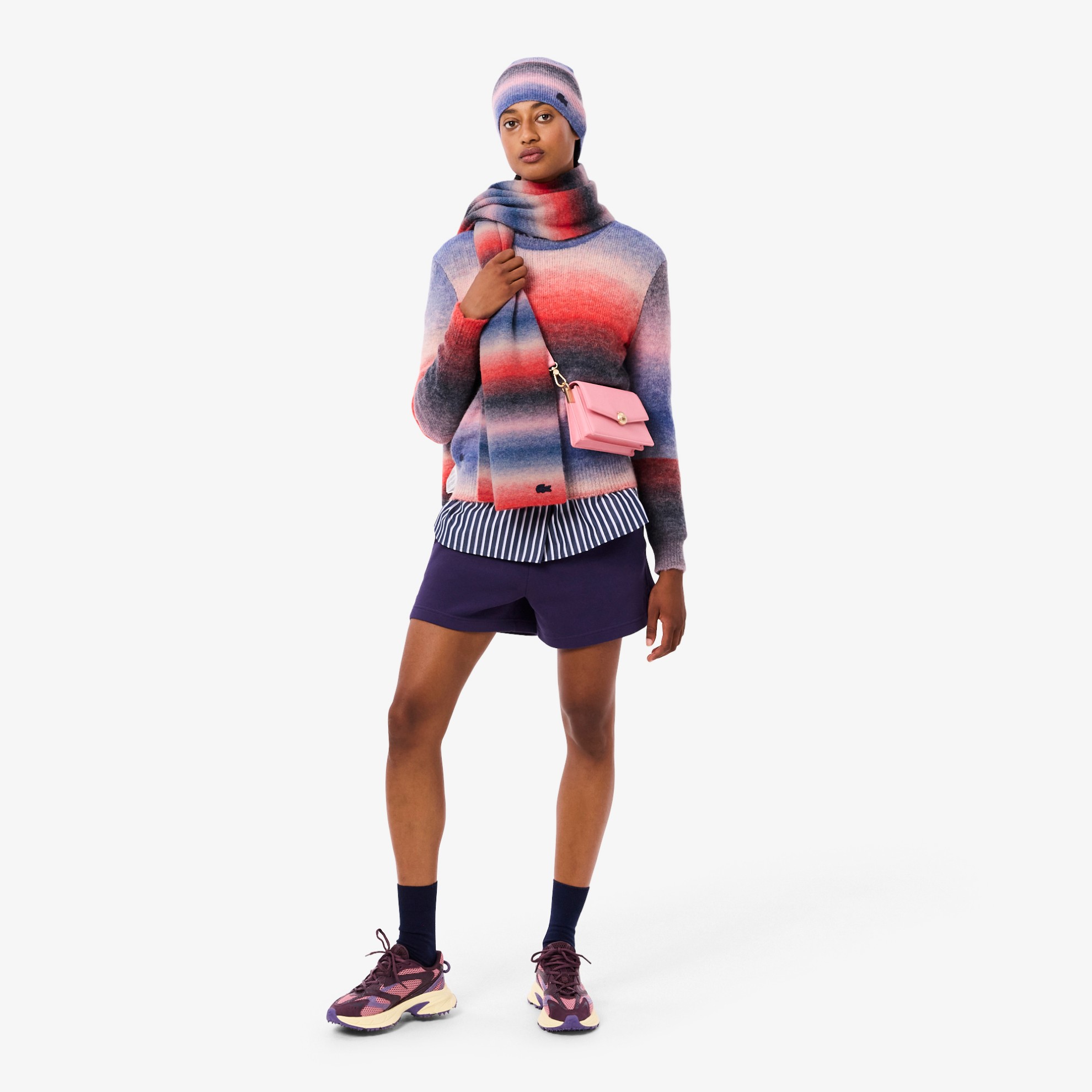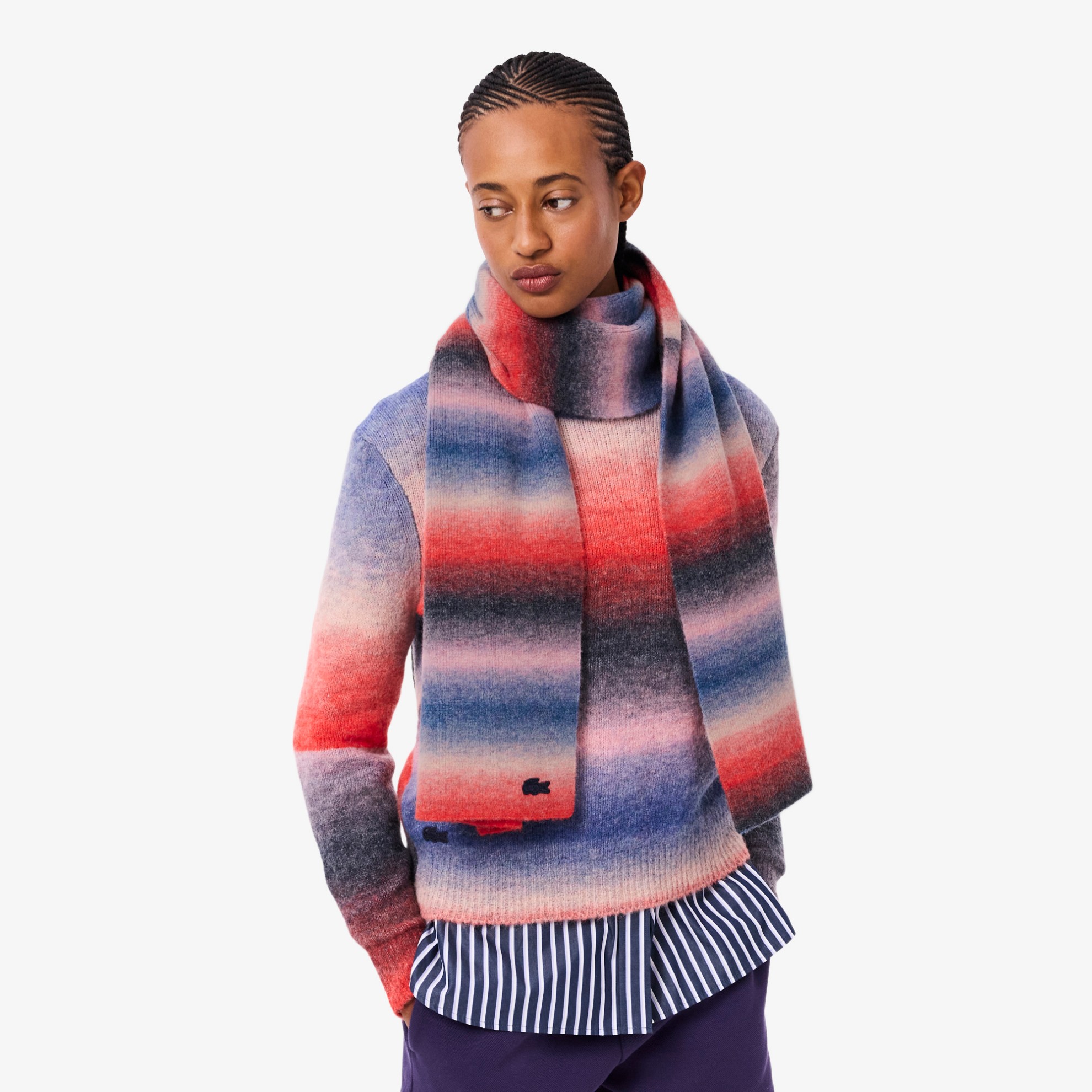 Ένα από τα αστέρια της συλλογής πλεκτών Lacoste, αυτό το κασκόλ είναι κατασκευασμένο από ζεστό, ελαστικό jersey από μείγμα μαλλιού. Το μοναδικό μείγμα νήματος διαφορετικών χρωμάτων δημιουργεί ένα εντυπωσιακό εφέ ομπρέ, προσθέτοντας μια εκλεπτυσμένη πινελιά σε κάθε look. Ένα εμβληματικό σχέδιο, με φινίρισμα από κροκόδειλο ομπρέ.